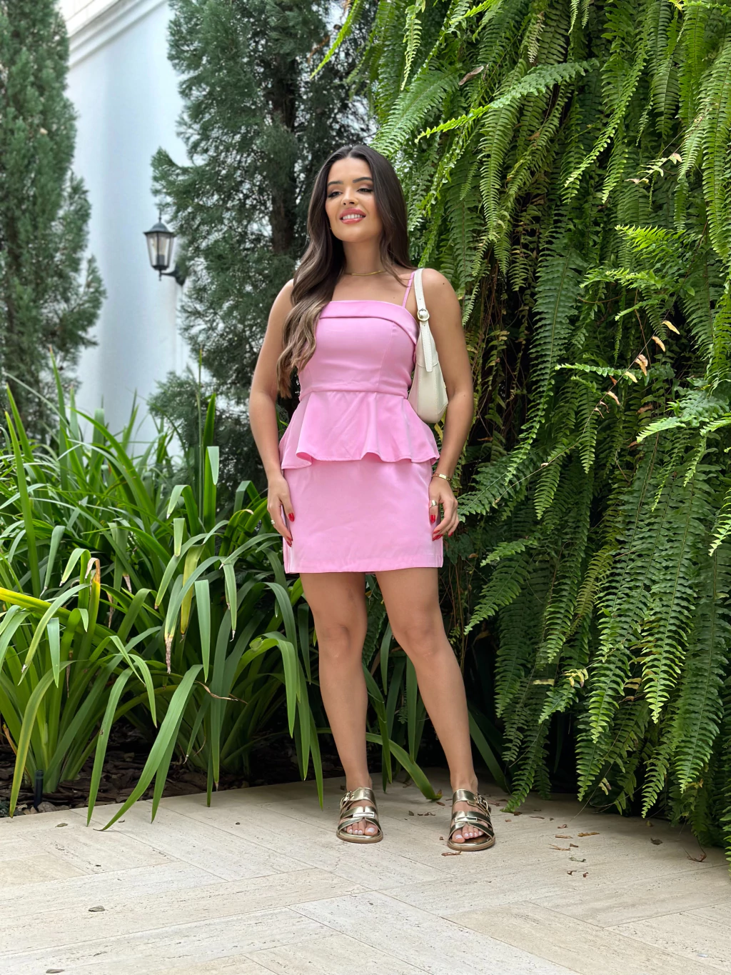 Composto por blusa e saia, sendo blusa estilo peplum, modelo com decote reto e alças finas. Tecido com forro e fêcho em zíper na parte de trás. Saia cintura alta com recorte reto, tecido com forro e fêcho com zíper lateral.
