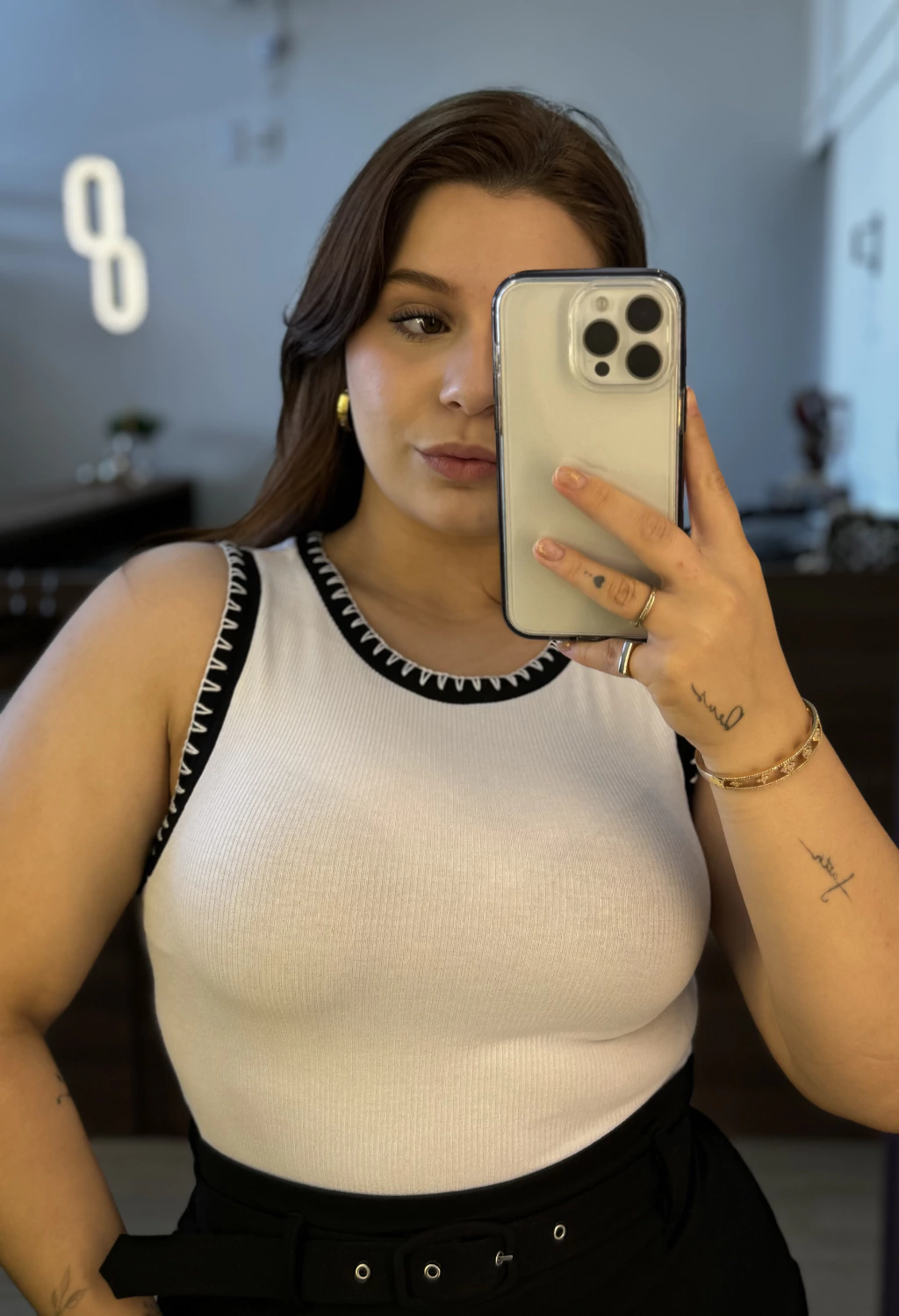 A regata Rosalia traz modernidade e sofisticação com seu design bicolor em tecido canelado, que se ajusta perfeitamente ao corpo. Os detalhes na gola e na cava adicionam um toque de estilo e originalidade à peça, destacando sua construção cuidadosa. Versátil e elegante, essa regata é ideal para compor looks que vão do casual ao refinado, proporcionando conforto sem abrir mão do charme.